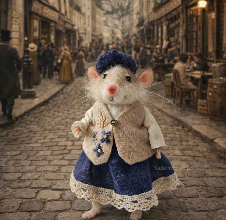 Madame Éléonore de Sourisette was born behind the velvet-lined walls of a Montmartre patisserie, where the air was always warm with sugar and whispered ambitions. Unlike other mice, she preferred poetry to crumbs and silk ribbons to shadows. Each morning, she dressed with care in her modest blue skirt and embroidered vest, believing that elegance was a form of quiet rebellion.
