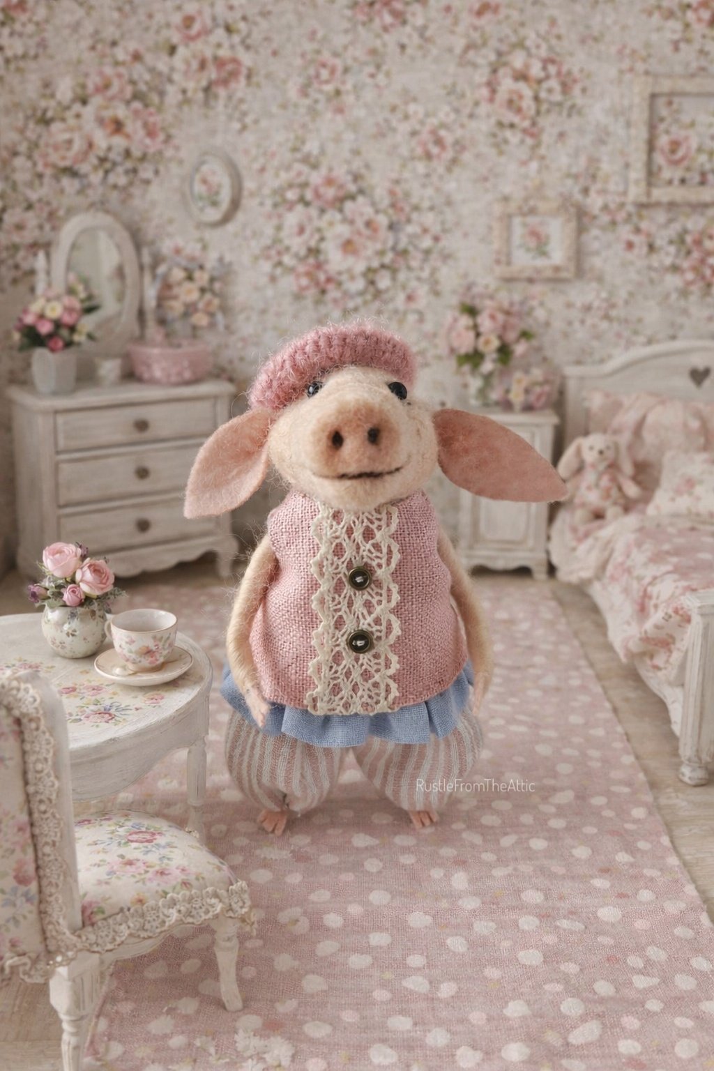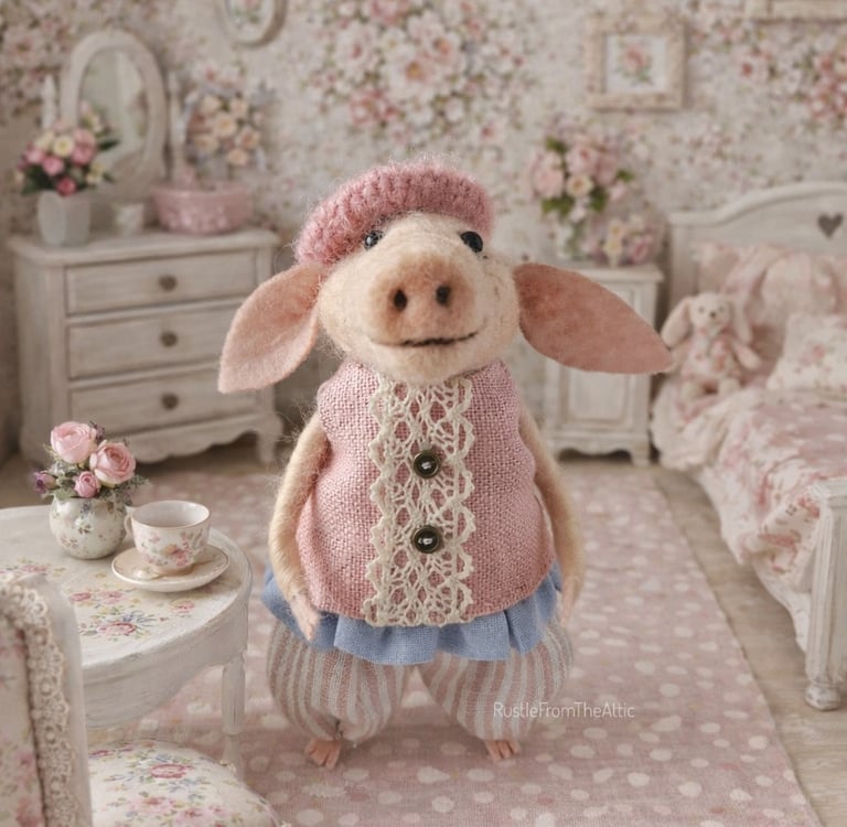 Miss Petal Snoutley lived in a tiny shabby-chic room where everything smelled faintly of roses and vanilla tea. Every morning, she adjusted her little pink beret, straightened the lace on her vest, and brewed herself a cup of tea in her favorite floral cup.