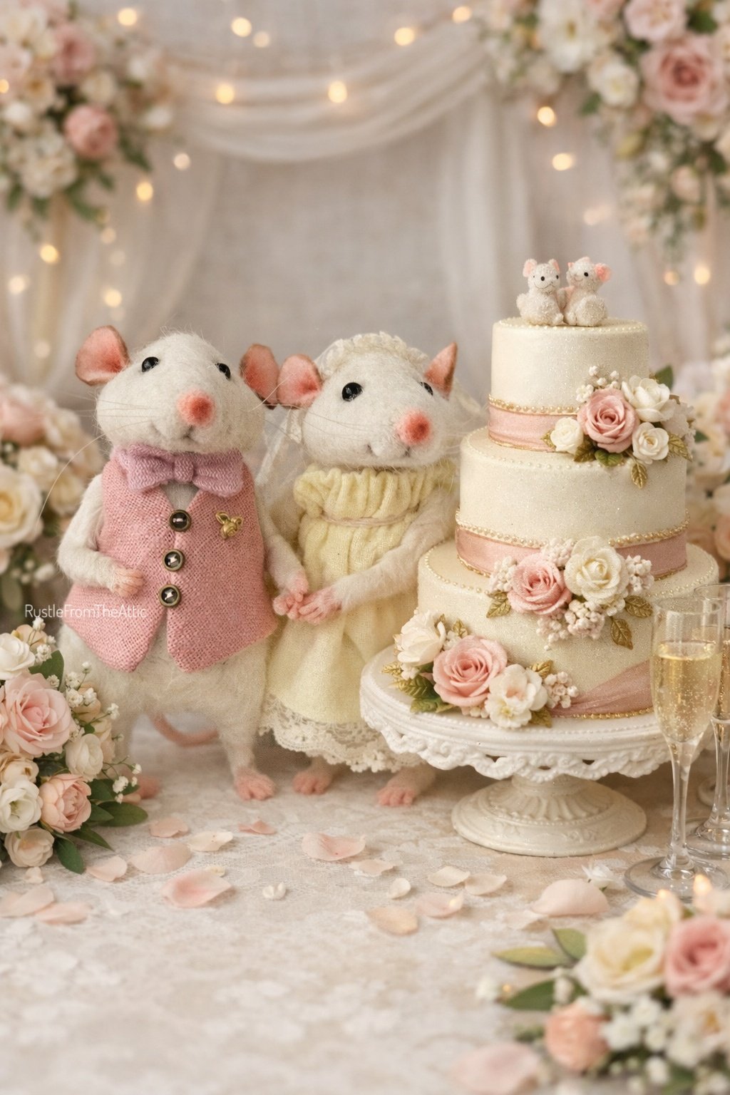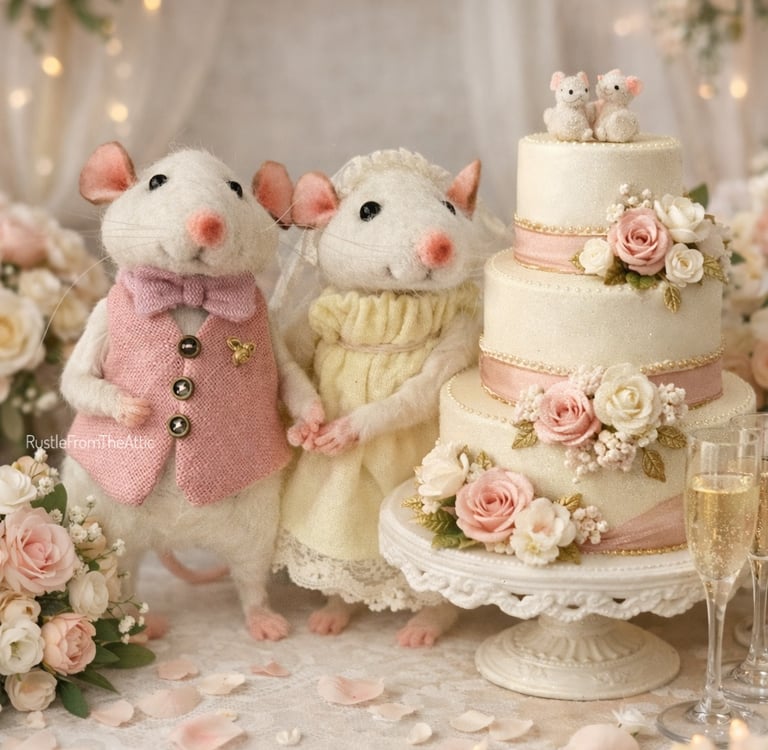 Oliver Mouse wore his favorite pink waistcoat, carefully stitched just for the occasion, with a tiny bow tie he had practiced tying for days. He was nervous but proud, whiskers twitching as he glanced at his bride. Lily Mouse floated beside him in a soft yellow dress, light as a summer breeze, trimmed with lace that reminded her of morning dew. A delicate veil rested between her ears, and her eyes shone brighter than the sun outside.
